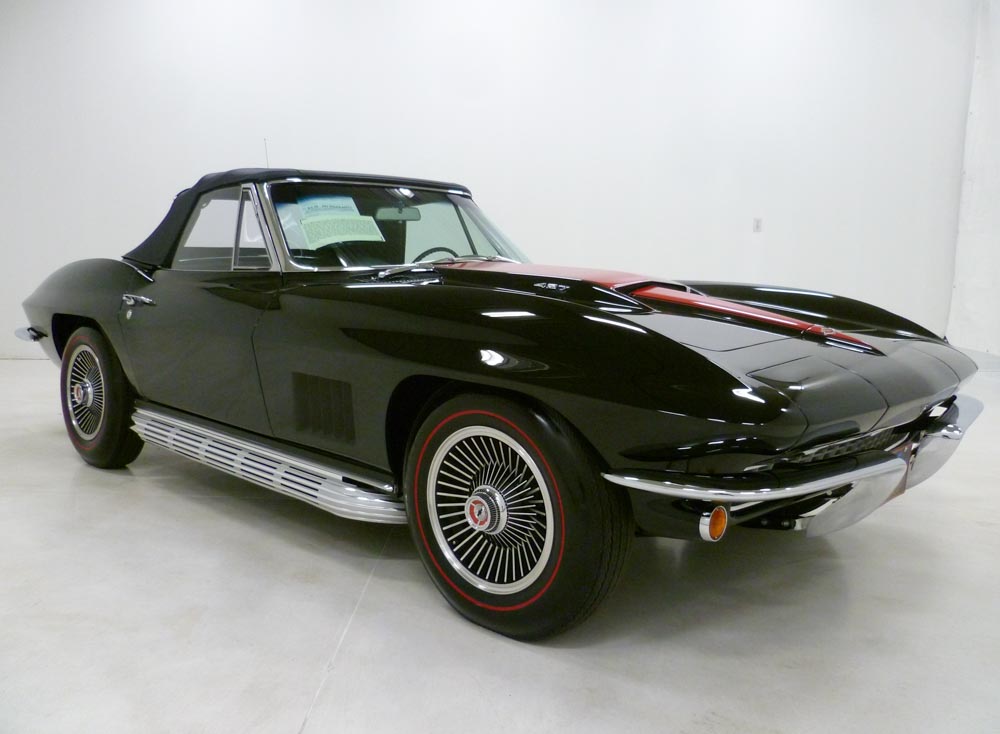 1008W..1967 Corvette Convertible, 427-390 hp, 4 speed, numbers matching original motor with CCAS/Grenning Affirmation and also has factory original body/trim tag. Tuxedo Black paint with Red stinger, Black interior and Black soft top. Comprehensive restoration that appears body-off in show condition for Bloomington Gold and NCRS type judging. Optioned with factory side exhaust, leather, M-21, posi, SS brakes, AM/FM radio, B.O. aluminum wheels and vintage Firestone 7.75x15" red stripe tires. Most all factory correct type components including the spare, jack handle, clear floor mats, shocks, seat belts, washer system, tar top battery, shifter, shielding, braided wires, air cleaner, alternator, #3811 carb, hoses, hose clamps, radiator, gas door assembly, Bowtie mirror, glove box door, owners manual and sales brochure. Documented with the CCAS/Grenning Engine Stamp Affirmation, owner history, two show boards and the NCRS Shipping Data Report with production date of September 6th, 1966 and delivered new by Van Chevrolet in Shawnee Mission, KS (dealer code 885 in zone 5) per the official NCRS/GM Shipping Data Records (SDR). This recently restored Corvette has yet to be shown, creating an exciting opportunity for the next owner to exhibit the car and compete for trophies, awards, and recognition! Looks, runs, and drives excellent. CC+2 $149,000.00